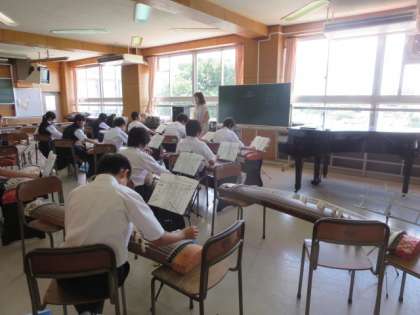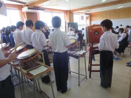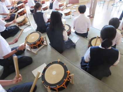 音楽 和楽器の授業 公開日 2017/07/05 更新日 2017/07/05 今日のできごと 本日、先週に引き続き、1年生の音楽の時間に2回目の和楽器の授業を行いました。各クラスを半分に分けて、「箏」と「和太鼓」の弾き方、たたき方を講師の先生に教えていただきました。それぞれの練習をした後、「箏」と「太鼓」を合わせて、合奏を行いました。1時間という短い時間ですが、生徒たちはお互いに息を合わせた合奏ができるまでになりました。日本の伝統文化に触れることのできた体験でした。 いいね(0)