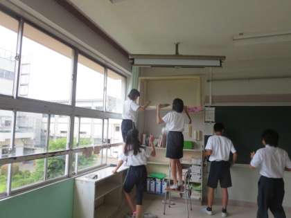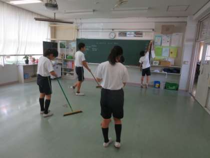 1学期の大掃除をしている様子です。普段は手の回らないところもきれいにしました。生徒たちは一生懸命に1学期間お世話になった施設を掃除しました。