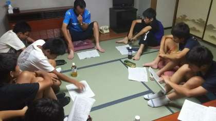 各部活動でミーティングを行っている様子です。本日の反省と明日の確認を行いました。このあと22時に消灯、就寝です。明日の練習に備えてぐっすり寝ます。