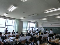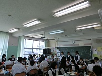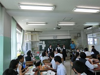 生徒会役員立候補者が給食の時間に各クラスを回って、立候補者と応援演説者が選挙運動を行っている様子です。立候補者は緊張しながらも、真剣にアピールしていました。