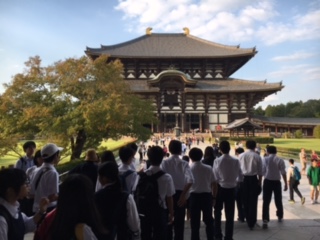奈良公園でクラス写真を撮り、東大寺を班ごとに見学しています。