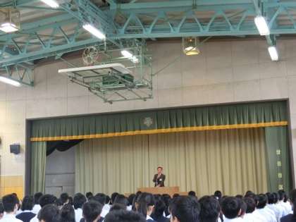 全校朝会を行いました。最初にバドミントン部の表彰がありました。