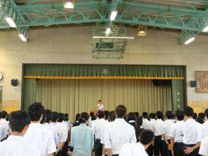 校長先生からは、「2学期の目標に向けて新たな気持ちで頑張ってほしいこと、3年生の修学旅行では、一人ひとりが自分の役割に責任をもって果たし、協力できたこと、これから予定されている2年生の校外学習、1年生の移動教室でも一生懸命にやることによって多くのことを学ぶことができること、様々なことに対する“姿勢”について、気持ち体の姿勢を正して生活することが大切であること、明日の世田谷区立中学校陸上競技大会に向けての励ましの言葉」などが話されました。生徒会からは「世田谷区立中学校陸上競技大会に向けての励まし、学芸発表会へ向けてしっかりと取り組んでいこう」という話がありました。生活指導主任の先生からは、「学校生活は様々な人たちに支えられていることをわすれないでほしい。」という話がありました。