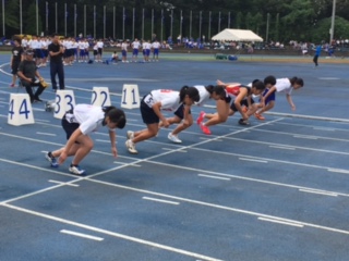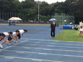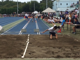 トラックでは2年女子100mが終了しました。フィールドでは走り幅跳びや走り高跳びを行なっています。