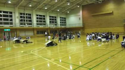 次のゲームは、段ボールを使った人間キャタピラーゲームです。みなさん盛り上がっています。
