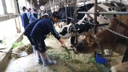 酪農体験、牛にえさを与える体験を行っています。