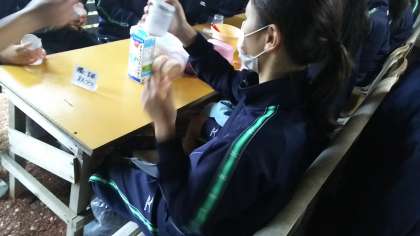 酪農体験、バター作りを体験している様子です。自分で作ったバターを食べます。