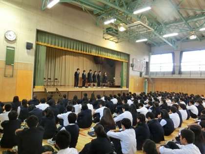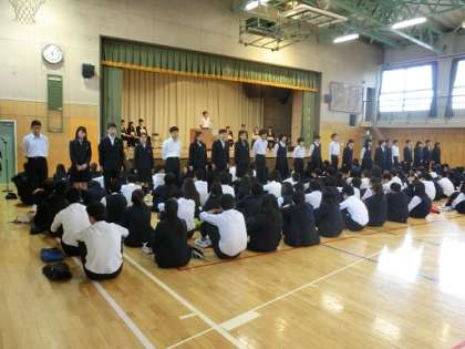 生徒会引継会 公開日 2017/10/14 更新日 2017/10/14 今日のできごと 10月14日(土)に後期生徒会引継会を行いました。前期生徒会役員のあいさつの後、後期生徒会役員の紹介、各委員会からの活動方針、活動内容の説明を行いました。後期の活動も生徒会のスローガンである「あいさつの輪を広げよう」、「一生懸命がかっこいい」を引き継いで活動を行います。この引継会をもって後期の生徒総会にかえ、後期生徒会活動が始まります。 いいね(0)