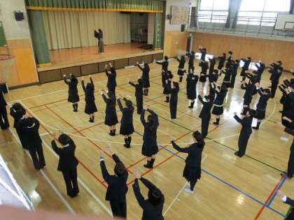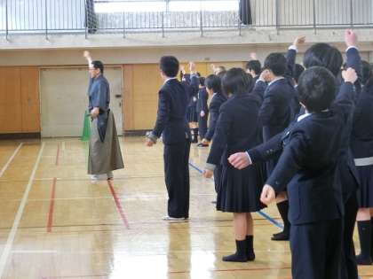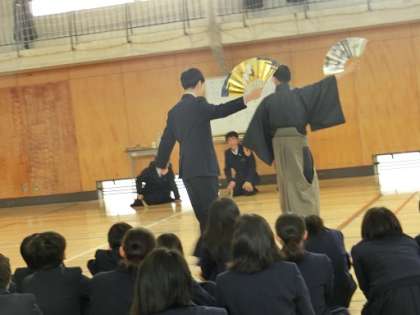 文化庁後援事業 公開日 2017/11/20 更新日 2017/11/20 今日のできごと 本日1校時と2校時に、2年生が、「文化庁 平成29年度 文化芸術による子供の育成事業(芸術家の派遣事業)」の一環として、「能」についての体験学習を行いました。講師の先生から「能」について説明を受けた後、実際に「能」の動きを体験しました。ほとんどの生徒たちが初めての経験でしたが、講師の先生の話を真剣に聞いて、一生懸命に体験学習を行いました。 いいね(0)