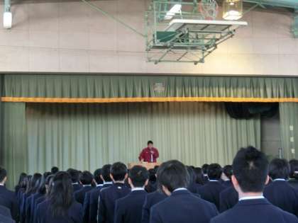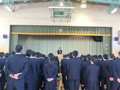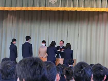 全校朝会 公開日 2017/12/11 更新日 2017/12/11 今日のできごと 全校朝会を行いました。校長先生からのお話、生徒会役員からの連絡、生活指導主任の先生から注意喚起のお話がありました。また、「税についての作文」で北沢青色申告会会長賞1名、北沢納税貯蓄組合連合会優秀賞3名、「税の標語」で北沢青色申告会会長賞1名、北沢間税会優秀賞1名、「一緒に読もう!新聞コンクール」で学校奨励賞、個人の奨励賞1名の表彰を行いました。 いいね(0)
