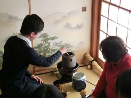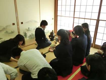茶道体験 3年生 公開日 2017/12/21 更新日 2017/12/21 今日のできごと 3年生が、教科「日本語」の日本文化の学習の一環として、茶道体験を行いました。全員の生徒がお茶をたて、和菓子をいただきながらお茶を飲みました。生徒たちはお茶をたてるときに、なかなか泡がたたずに苦労していました。苦労してたてたお茶の味は格別だった様子です。また、講師の先生からお茶をいただくときの作法も教えていただきました。良き日本文化に触れたひと時でした。 いいね(0)
