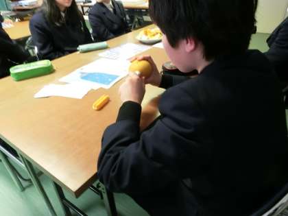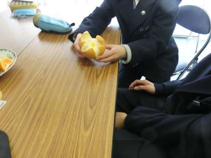 愛媛県にある無茶々園から佐藤哲三郎様、藤森美佳様を講師としてお招きして、1年生が食育授業を行いました。無茶々園の全体の紹介、農薬を抑えた栽培を行っていること、柑橘の食べ比べ、ちりめん漁について、環境活動、わかめの色変わり、ちりめんモンスター(ちりめんの中に混ざっている小魚など)探し等の内容でした。生徒たちは、講師の先生の話に真剣に耳を傾け、柑橘の食べ比べ、ちりめんモンスター探しなどの体験を楽しそうに行っていました。また、最後の感想文も一生懸命に書いていました。
