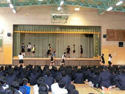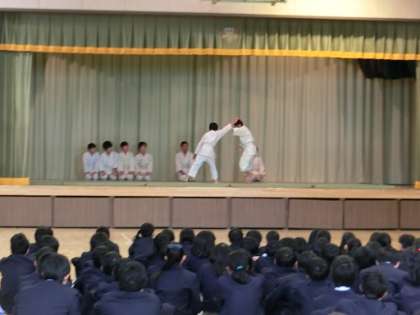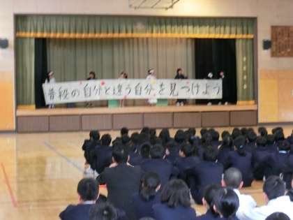 部活動説明会 公開日 2018/04/10 更新日 2018/04/10 今日のできごと 1年生全員と、2・3年生の転入生対象に、生徒会主催の部活動説明会を実施しました。司会の生徒会役員の進行に従って、それぞれの部活動の特徴を表現した紹介をしました。その後、部活動担当の先生から、体験入部、本入部の手続き等の説明、部活動を行う上での心構えなどの話がありました。部活動紹介を見ている1年生は真剣な表情をしていました。また、他の部活動の紹介を見ている2・3年生の態度も立派でした。 いいね(0)