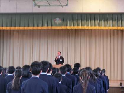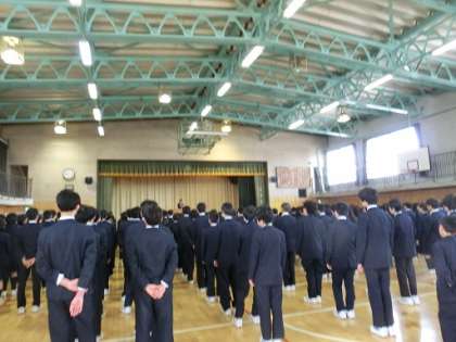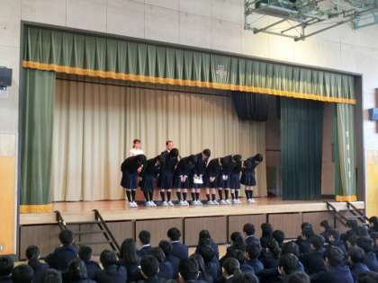 全校朝会を行いました。各学年の全校生徒が整然と静かに体育館に入ってきました。校長先生からは、「生徒の皆さんは挨拶を交わし合って、良いスタートが切れました。始業式、入学式では、3年生、2年生がしっかりとした態度で臨めました。1年生も頑張っていました。また、土曜日の身体計測では、担当の先生の指示に従い、良い態度でやっていました。この気持ちを忘れないでいてください。そして、メリハリのある生活を送るようにしてください。」という話があり、“まきた しんじ” さんの「教室はまちがうところだ」という詩の抜粋を紹介しました。(全文は校長室前に掲示します。)そして、「みんなが成長できる緑丘中学校になってほしい。」などという話がありました。生徒会からは、部活動(1年生の仮入部のことも含む)、専門委員会についての話がありました。生活指導主任の先生からは、「時間を守ることを意識して、落ち着いた生活を送ってください。」という話がありました。その後、バスケットボール部女子、男子、女子バレーボール部の表彰を行いました。