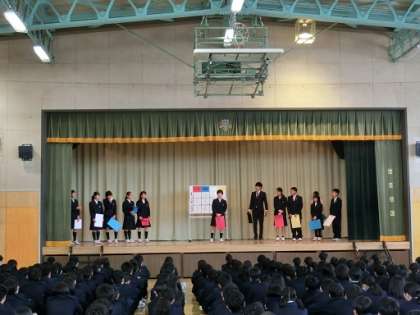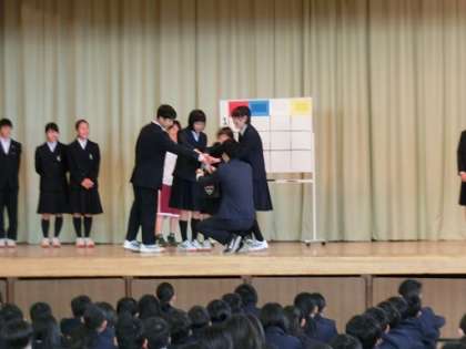 6月2日(土)に開催する体育大会に向けて、各クラスの色決めを全校朝会の後に行いました。3年生各クラスの団長、1,2年生の各クラスの代表が舞台上でくじを引いて、決定しました。結果は、赤組−3年3組・2年4組・1年1組、青組—3年4組・2年1組・1年3組、白組—3年1組・2年2組、1年4組、黄組—3年2組・2年3組・1年2組という結果になりました。その後、各色の団長から、体育大会に向けての決意表明を行いました。