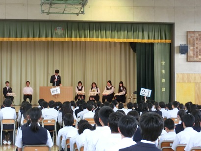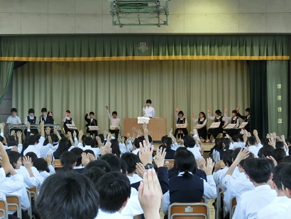 生徒総会 公開日 2018/05/02 更新日 2018/05/02 今日のできごと 生徒総会を行いました。生徒会役員、各委員長が活動方針を舞台上で発表し、質疑応答の後、全校生徒の承認を得ました。生徒総会に参加した生徒たちは、静かに真剣に活動方針を聞いていました。生徒会活動は、生徒による自治活動です。生徒会役員会、各委員会の活動方針は、自分たちで、より良い学校を作っていこうという意欲が見られるものでした。これから生徒の活発で自主的な活動が期待されます。 いいね(0)