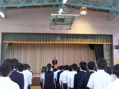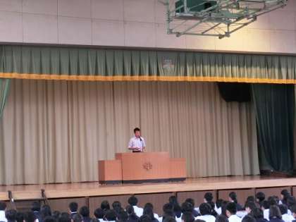 5月7日(月)に全校朝会を行いました。校長先生からは、「本日の全校朝は良い状態で集合でき、3年生を中心にこの状態を維持してほしいということ」、「ゴールデンウィークをどのように過ごして、4月からの自分を振り返ることができたのか、今自分ができることをスモールステップで行っていくと良いこと」、「体育大会に向けてお互いが良いところ認め合っていくと良いこと」などの話がありました。生活指導主任の先生からは、「5月1日より始まっている衣替えの移行期間中の服装をしっかりしてほしい」、「体育大会向けて集中した行動をとってほしい」という話がありました。生徒会からは、「これからの生徒会活動をしっかり取り組んでいこう」、「体育大会に向けて、一生懸命に取り組もう」とういう話がありました。みどりのボランティア部からは、5月17日(木)16時より体育大会に向けて校庭のまわりの草を取る「草刈りボランティア」を行います。という話がありました。