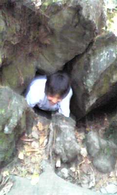 はしごを降りて、溶岩樹型を体験中。穴から出てきたところです。