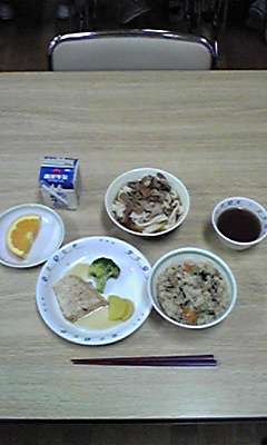 本日の夕食です。メニューは、炊き込みご飯、焼き魚、うどん、オレンジ、牛乳、お茶です。