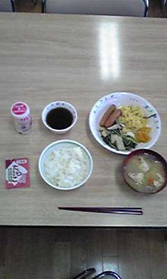 朝早く起きて、お腹もすいたことでしょう。では、「いただきます」。2日目の朝食メニューは、ご飯、豚汁、ウィンナー、しらす入りスクランブルエッグ、ほうれん草のゴマ和え、たくあん、麦茶です。