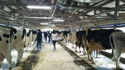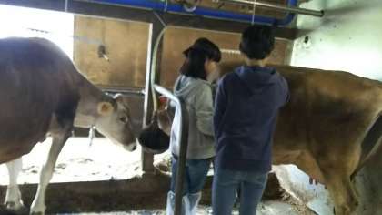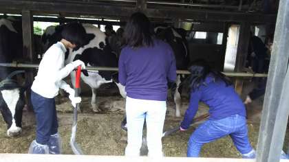 牛のブラッシング、えさやり、清掃の体験をしている様子です。
