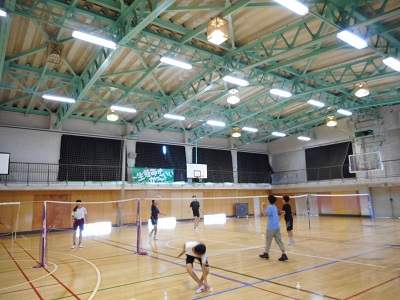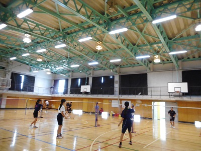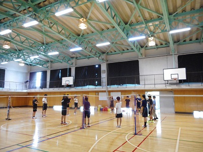 バドミントン部の部活動体験の様子です。体育館の中は暑いので、熱中症対策のために、大型扇風機をつけながら活動しています。指導する中学生、体験している児童とも頑張っています。
