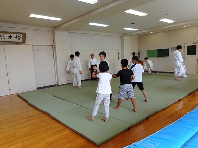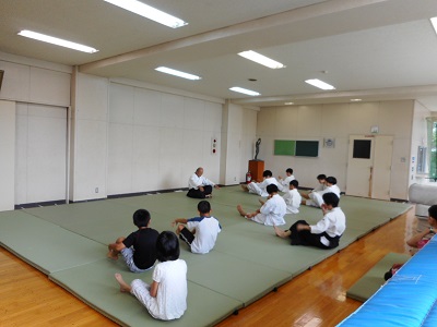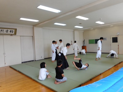 夏休み中の部活動体験、合気道部の体験の様子です。初めて合気道に触れる児童もいて、まず、体をほぐしてから、基本動作や受け身の練習から行っています。今回の部活動体験が良い経験となるとよいです。