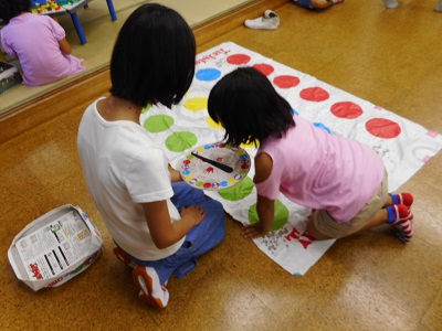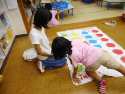 ボランティア部の生徒が、八幡山小学校の新BOPでボランティア活動をしている様子です。生徒は、小学生に優しく声をかけています。小学生はとても楽しそうにゲームを行っていました。