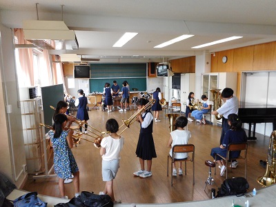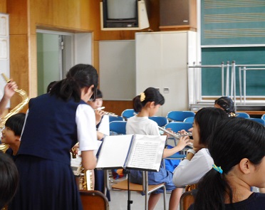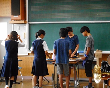 吹奏楽部の部活動体験の様子です。中学生たちは、ていねいに小学生に指導をしています。