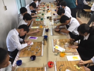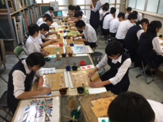 昼食の後に、丸益西村屋で友禅染の体験学習をしています。