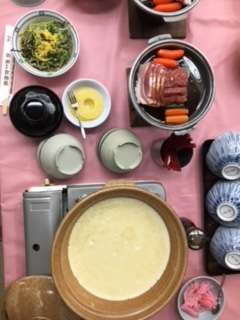 二日目の夕食は、焼き肉、出来立ての豆腐、茶そばなどです。1日の疲れを取れるように、しっかりと食べましょう。