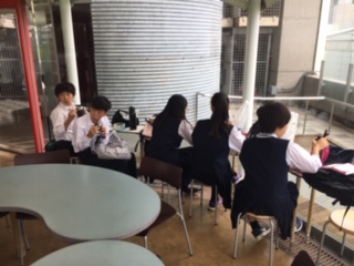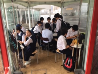 江戸東京博物館でチェックをして、お弁当を食べています。昼食後、班行動を再開します。
