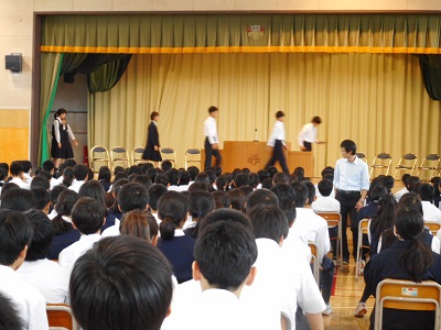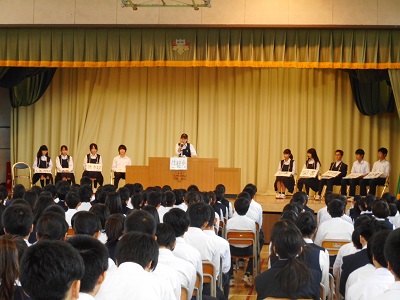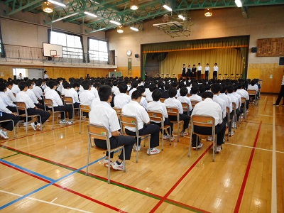 学校の諸活動を生徒会が自主的に進めているという意識をもち、そのことを全生徒が確認するということを目的として、後期生徒会引継会を行いました。後期のメンバー紹介、活動方針・活動内容の発表、前期生徒会役員からの一言がありました。これから生徒会の活発な活動が期待できます。