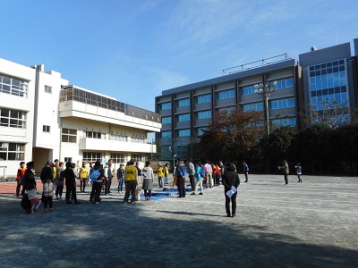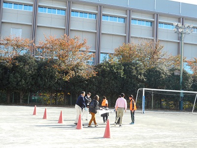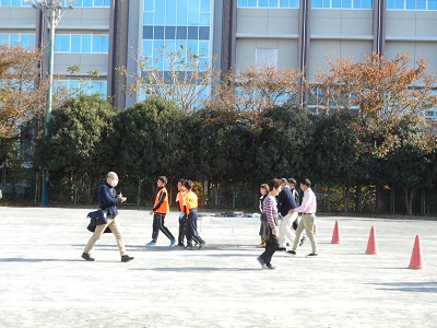 避難所訓練 あんしんすこやかセンターの方から指導を受けて、担架搬送訓練を行っている様子です。