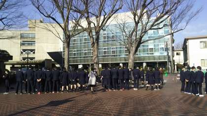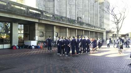 合唱コンクールの会場となる世田谷区民会館ホールの前で朝練習をしている様子です。生徒たちは真剣そのものです。