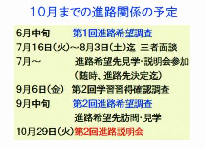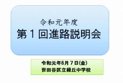 本校の中学3年生の意識調査や昨年度の入試状況、都立私立高校の制度やしくみ、緑丘中学校の推薦基準や心がまえ、学校説明会等の話がありました。