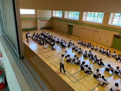 地区ごとに集まり、災害時に生徒が協力して安全に帰宅できるように地域班を確認しました。