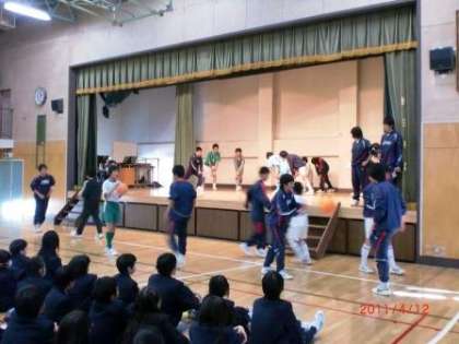 平成23年度がスタートしました。今年度もよろしくお願いいたします。今日の午後は、恒例の「部活動説明会」が行われ、新入生の前で各部活動の先輩方が工夫をこらして活動の説明をし勧誘をおこないました。今年は運動系、文化系合わせて15の部活動と2つのステップが1年を通して活動します。来週いっぱいが仮入部期間です。