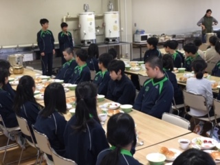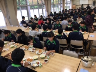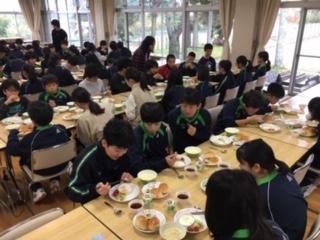 移動教室最終日の朝食は、洋食です。しっかり食べて、酪農体験に備えます。