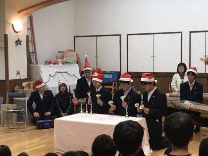 本日16時から早苗保育園にてボランティア部によるクリスマス演奏会が行われました。クリスマス曲をハンドベルと箏で演奏しました。また後半は、なぞなぞ大会などを行いました。園児たちが楽しみ喜ぶ、とても素晴らしい活動となりました。
