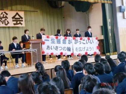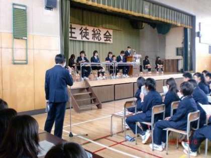 5月6日の5校時に前期生徒総会が行われました。各委員会の活動方針と活動内容が発表され、それに対して各クラスから「ボランティアとは具体的に何をやるのですか」「図書の午後の貸し出しはできないのですか」など全部で20の質問が出されました。最後に生徒会本部役員会から,生徒会スローガンの説明があり、これから約半年間、各委員会が緑丘中学校のため一生懸命に活動すること、そして生徒全員がそれを応援し支えていくよう呼びかけを行いました。