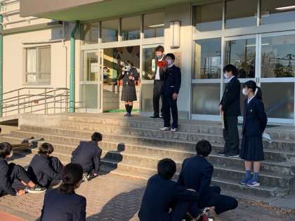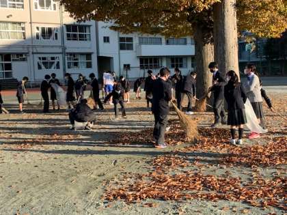 落ち葉掃きボランティア活動 公開日 2020/12/08 更新日 2020/12/08 今日のできごと 12月8日の7時50分から毎年恒例となっている生徒会と緑のボランティア部が企画運営する落ち葉掃きボランティアを開催しました。 早朝にもかかわらず94人の生徒たちが参加し生徒会長の挨拶後、校庭や学校周りも含めて参加者全員が積極的に気持ちよく作業をしていました。 いいね(0)
