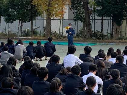 本日4校時終了後、地震後に火災発生の設定で避難訓練を実施しました。訓練の様子を上北沢消防署の方々に見ていただき訓練後に講評をいただきました。