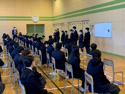 12月23日(水)5校時、格技室において1年生が2学期のまとめとして学年集会を行いました。寒さが厳しくひざ掛けやコートを羽織りながらでしたが集中して、クラスの反省や先生方の話を聞くことができました。1年生の学年集会では話してくれた人へ、声を合わせて「ありがとうございました」と挨拶をします。格技室に響き渡るこの声こそが1年生の成長を感じられる瞬間です。