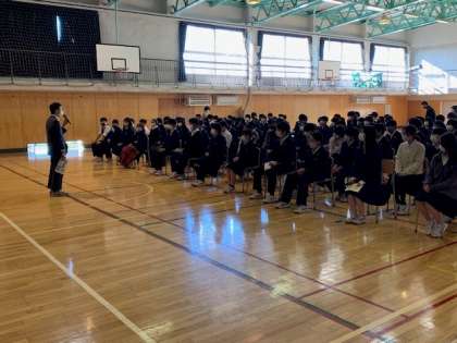 12月23日(水)5校時、3年生は体育館において学年集会を行い、2学期を振り返り反省と目標の確認をしました。各クラスの学級委員と生活面・学習面・進路について先生方から話される内容は、受験の話と健康に関することが中心となりました。3年生は話の後に、全員で拍手をします。その拍手は今日話された反省を生かして3学期に向けみんなで頑張ろうという自分たちへのエールのように感じられました。