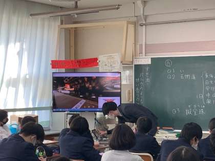 1月19日、2年生は延期になった校外学習に向け再学習をスタートしました。ICTを使い、江戸東京博物館の「360°VIEW」で博物館の中にバーチャルで入り込みます。先生がタブレットをドラッグするとエスカレーターで2階へ移動したり、歩いているように展示物を見ることができます。校外学習後にバーチャルと実際に見た違いなど感想を聞いてみたいです。