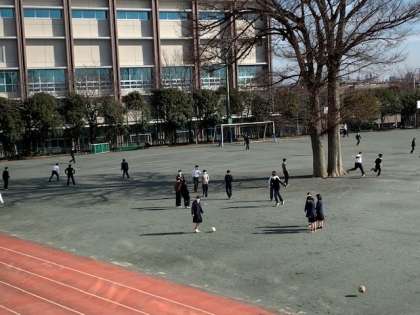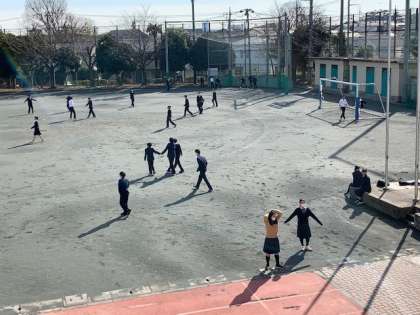 昨日の冷たい雨模様から一変して、少し暖かい晴天のもと昼休みのチャイムとともに校庭に全学年の生徒たちが走りこんできます。サッカーやバレーボール、そして日向に座ってのおしゃべりなど、それぞれのスタイルでのんびりと昼休みを楽しんでいます。