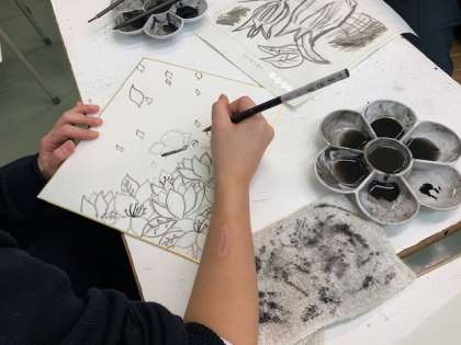 考えがまとまった生徒は、ぼかしやかすれ等、墨・顔彩の特徴をもとに、水墨画の構想を下絵に描き始めました。