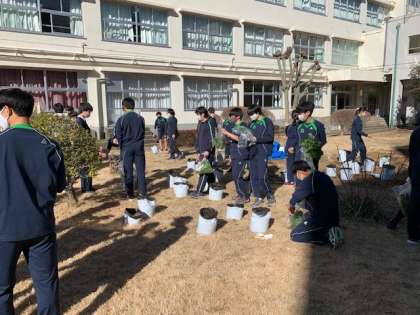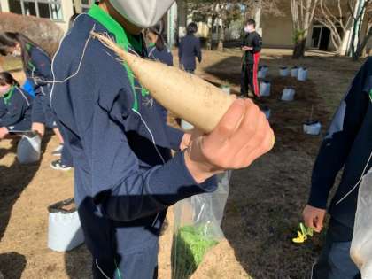 3年生は技術の授業で生物育成について学び大根を育成しました。昨年の土づくりから始まり、間引きや防虫などの育成技術を使い本日収穫となりました。収穫した大根の大きさに一喜一憂し歓声があがっていました。