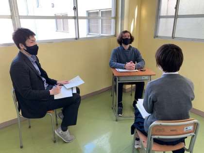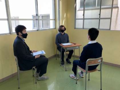 3年生の英語授業では、外国語講師(ALT)に自分の考えを発表したのちにALT講師に質問して会話をするテストを行いました。積極的にコミュニケーションをとる姿勢が素晴らしいとALT講師が授業後コメントしていました。